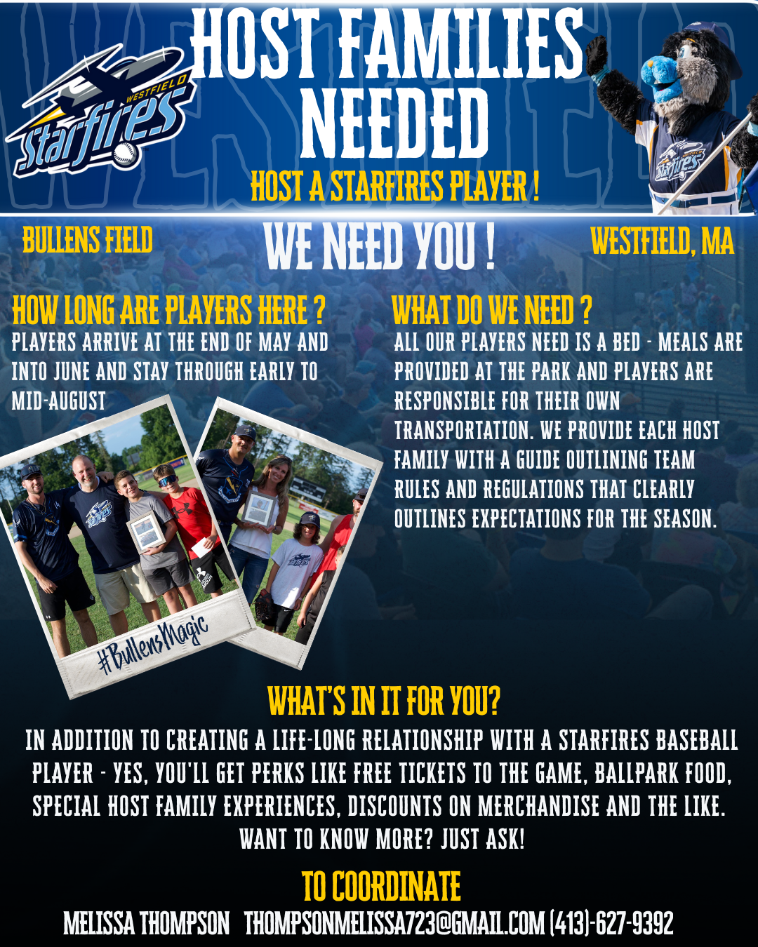 In addition to creating a life-long relationship with a Starfires baseball player – YES, you’ll get perks like free tickets to the game, special host family experiences, discounts on merchandise and the like. Want to know more? Just ask!